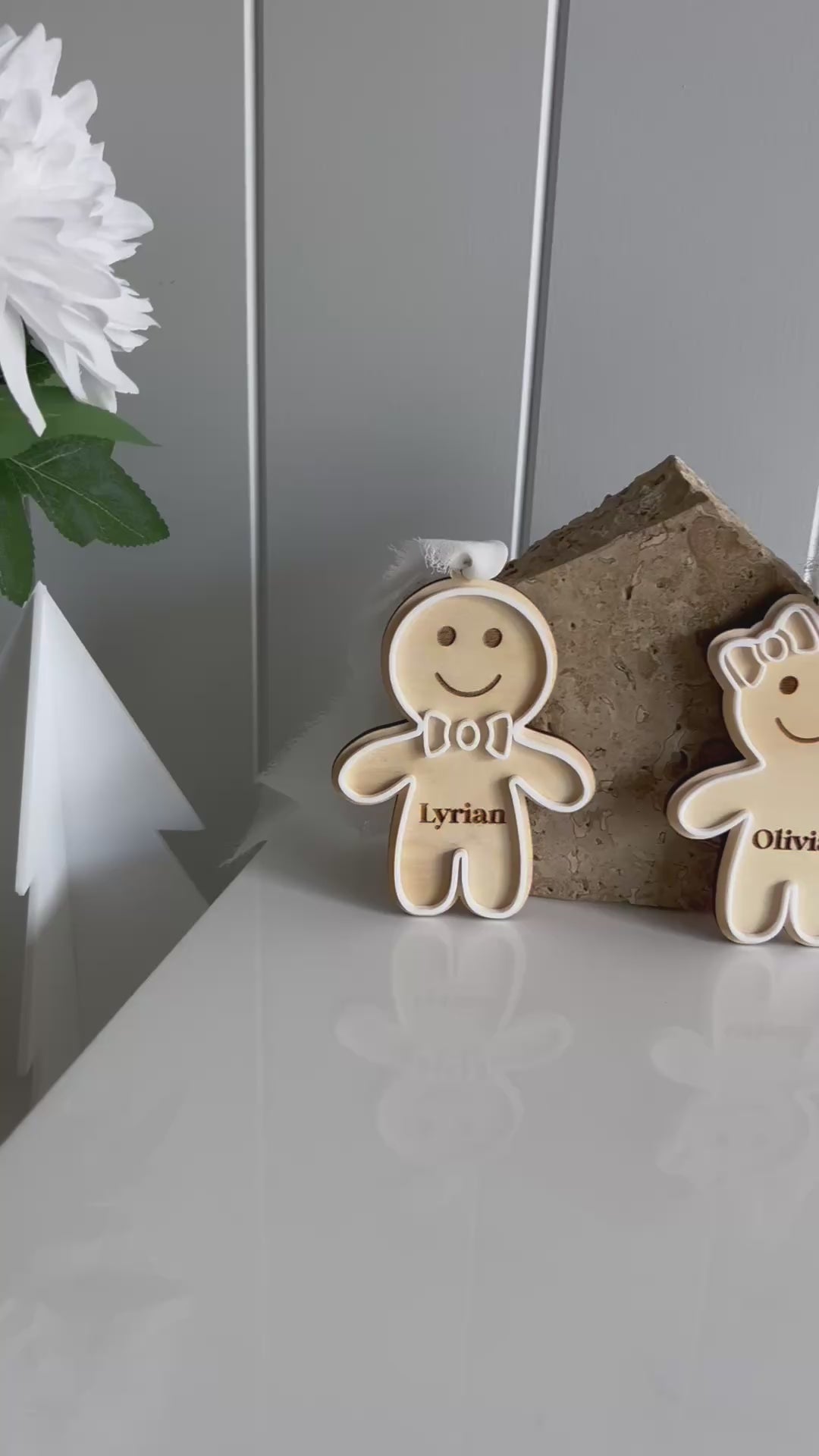 Crafted from 4.5 mm natural wood and layered with white acrylic detail, each gingerbread figure is customised with a name and finished with a soft frayed-edge ribbon. Choose from our bow or bowtie design to suit your family, and create a set that’s as unique as you are.